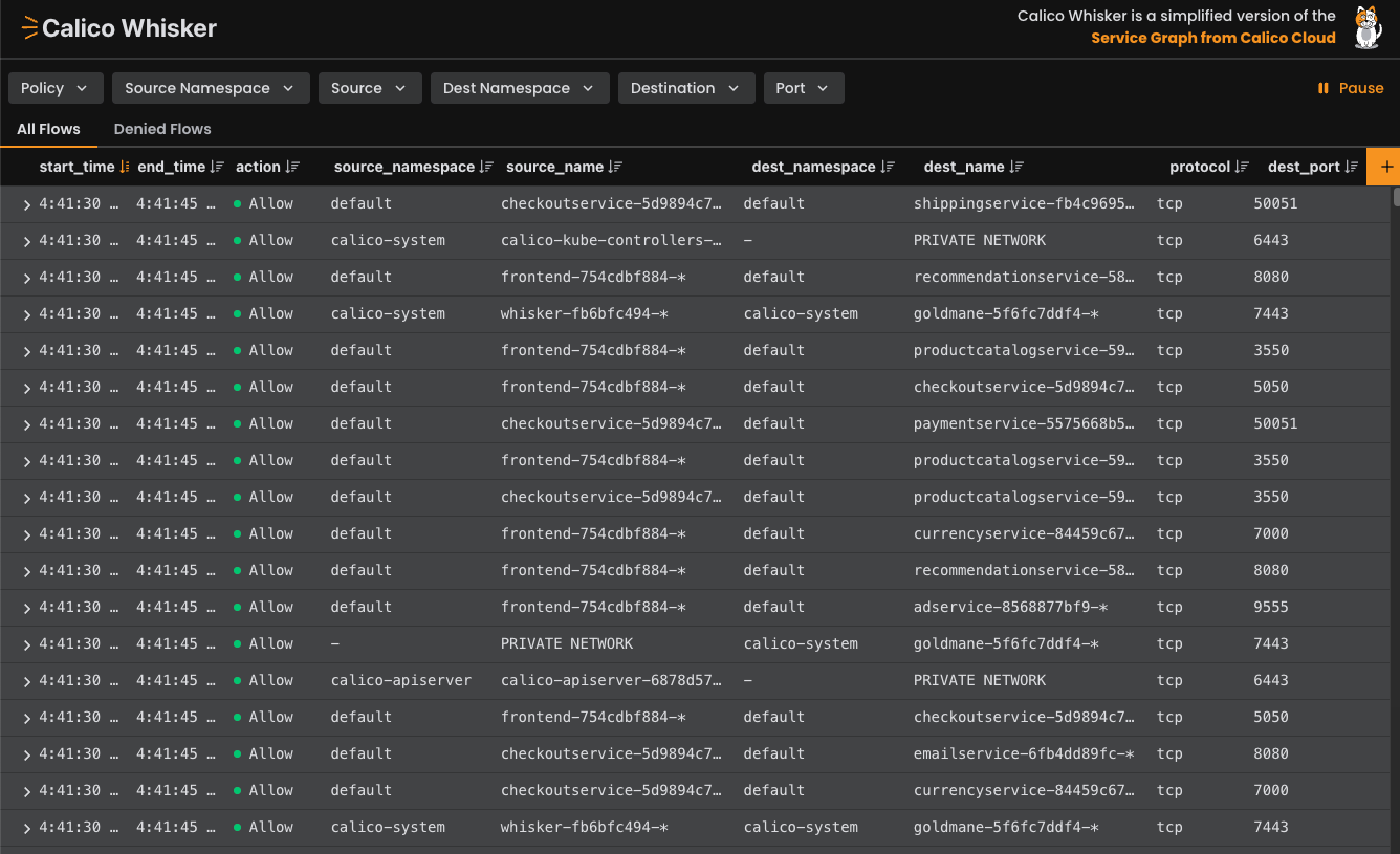 The Calico Whisker web console is a browser-based interface that shows you a stream of flow logs from your cluster in real time. While the console is open, it receives live data from a dedicated flow logs API (Goldmane). You can filter the stream to see only the logs for a particular policy, namespace, pod, or other criteria.